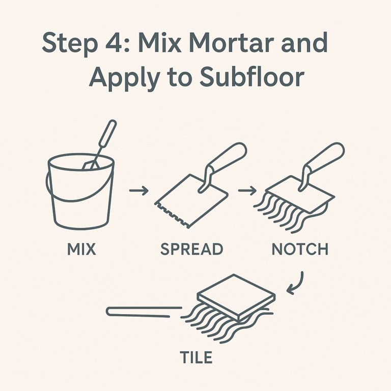 Use a notched trowel to spread the mortar evenly on a small part of the subfloor. Hold the trowel at a 45-degree angle to make even ridges. These ridges help the material stick well and keep the surface flat.